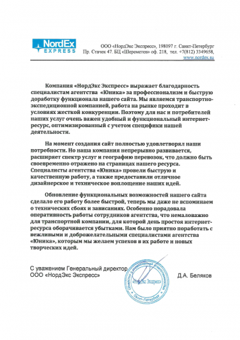 Компания «НордЭкс Экспресс» выражает благодарность специалистам агентства «Юника» за профессионализм и быструю доработку функционала нашего сайта. Мы являемся транспортно-экспедиционной компанией, работа на рынке проходит в условиях жесткой конкуренции. Поэтому для нас и потребителей наших услуг очень важен удобный и функциональный интернет-ресурс, оптимизированный с учетом специфики нашей деятельности.