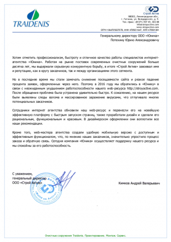 Хотим отметить профессионализм, быстроту и отличное качество работы специалистов интернет-агентства «Юника». Работая на рынке поставок современных очистных сооружений больше десятка лет, мы выдержали серьезную конкурентную борьбу, в итоге «Строй Актив» завоевал имя и репутацию, как в кругу заказчиков, так и между организациями этого сегмента.